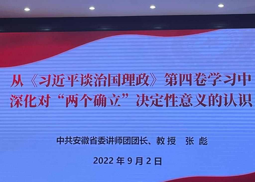 为贯彻落实习近平总书记在省部级主要领导干部专题研讨班上重要讲话精神,全省开展“举旗帜·送理论”省级示范宣讲活动。淮北市委宣传部邀请了中共安徽省委讲师团团长张彪教授于9月2日上午9时在市公安局报告厅作宣讲报告,张团长宣讲的主题为:从《习近平谈治国理政》第四卷学习中深化对“两个确立”决定性意义的认识。koko体育官网刘奔前和孙澄澄老师作为入选的淮北市宣讲团成员,代表学校参加会议。