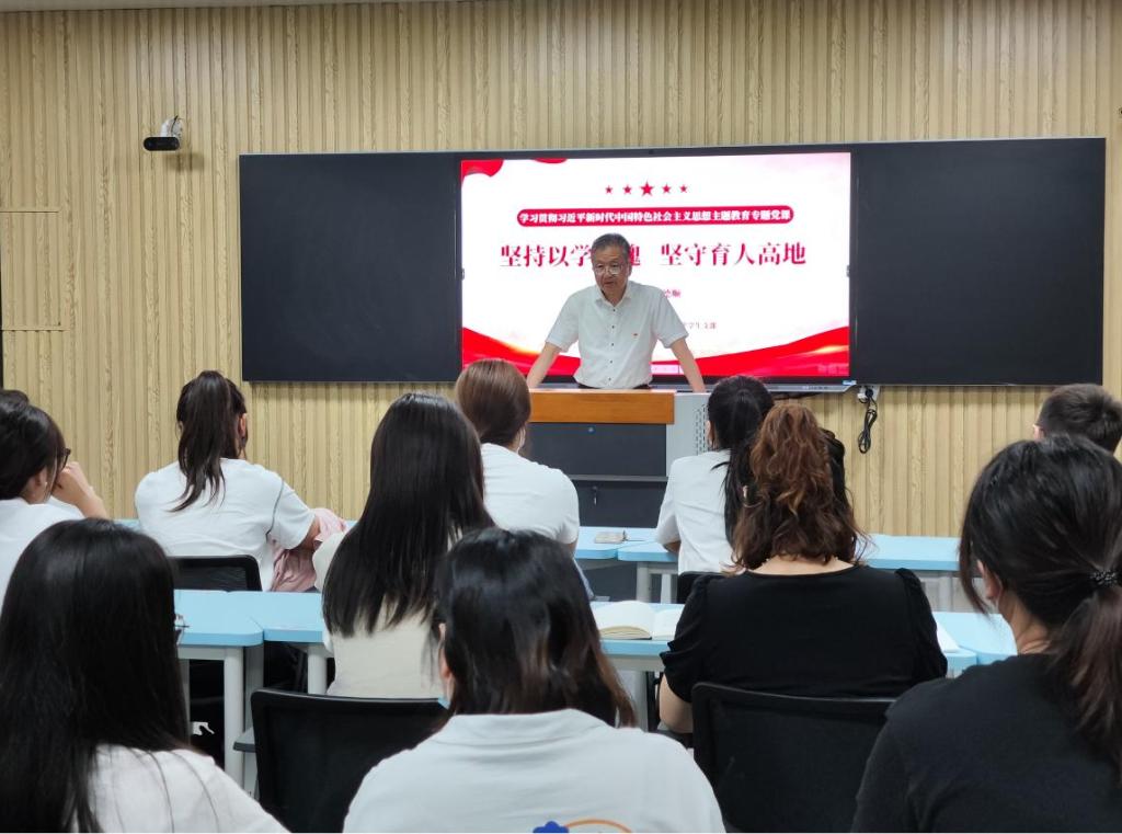 朱德顺根据主题教育“四个讲清楚”的要求,围绕主题并结合学院具体情况,重点从习近平新时代中国特色社会主义思想的科学体系、核心要义、实践要求以及贯穿其中的立场观点方法;党的二十大精神中的战略部署和目标要求;习近平总书记关于教育工作的重要论述;以学铸魂做一名合格思政课老师、学生如何在德智体美劳全面发展等方面进行了论述。